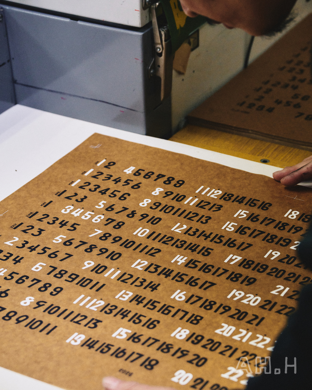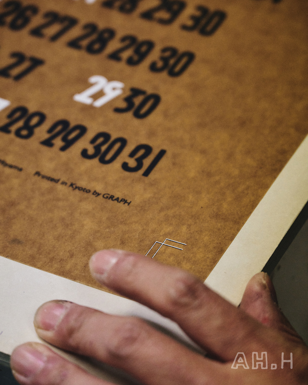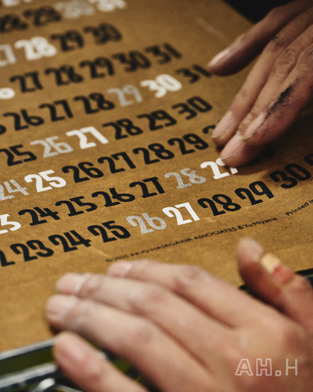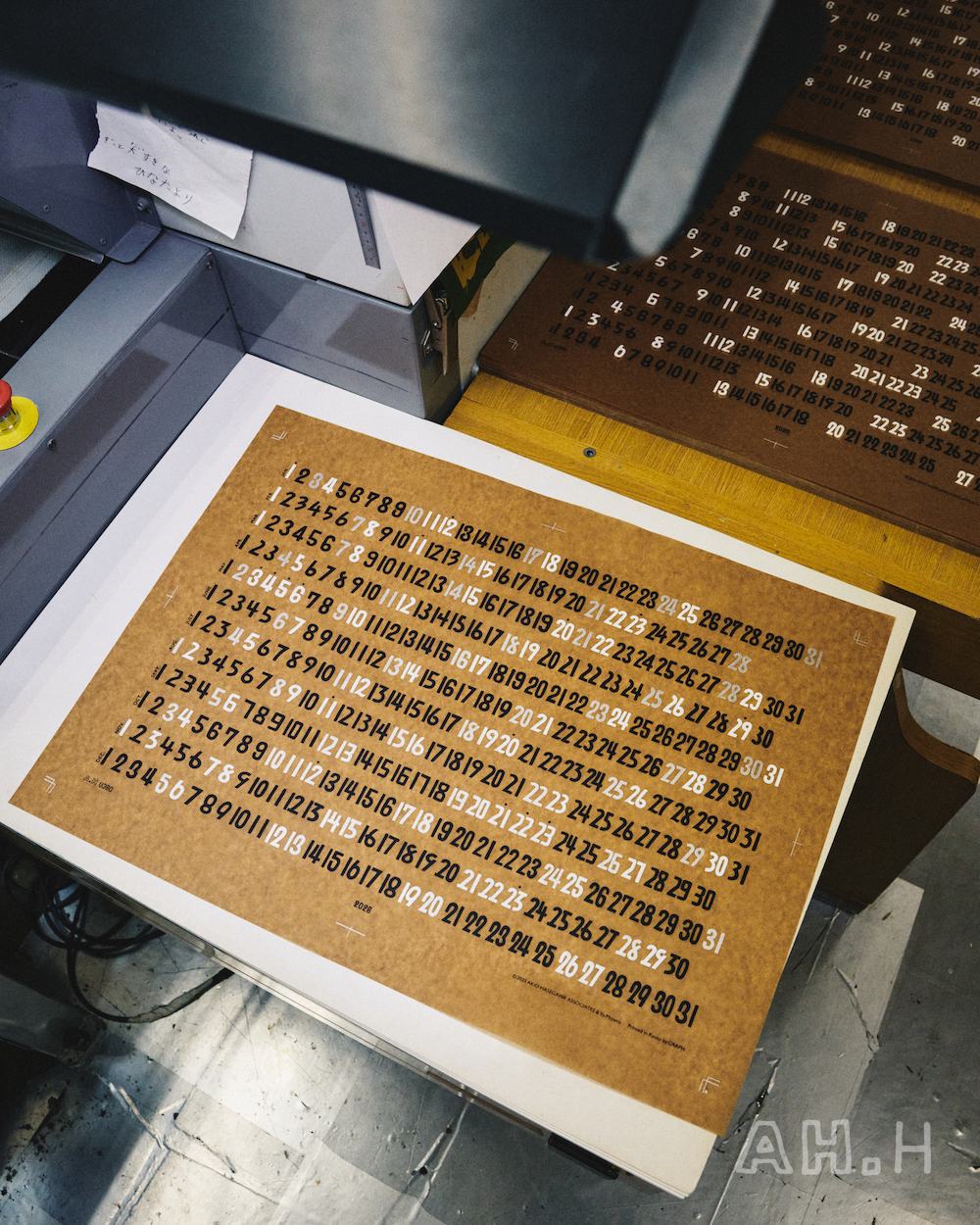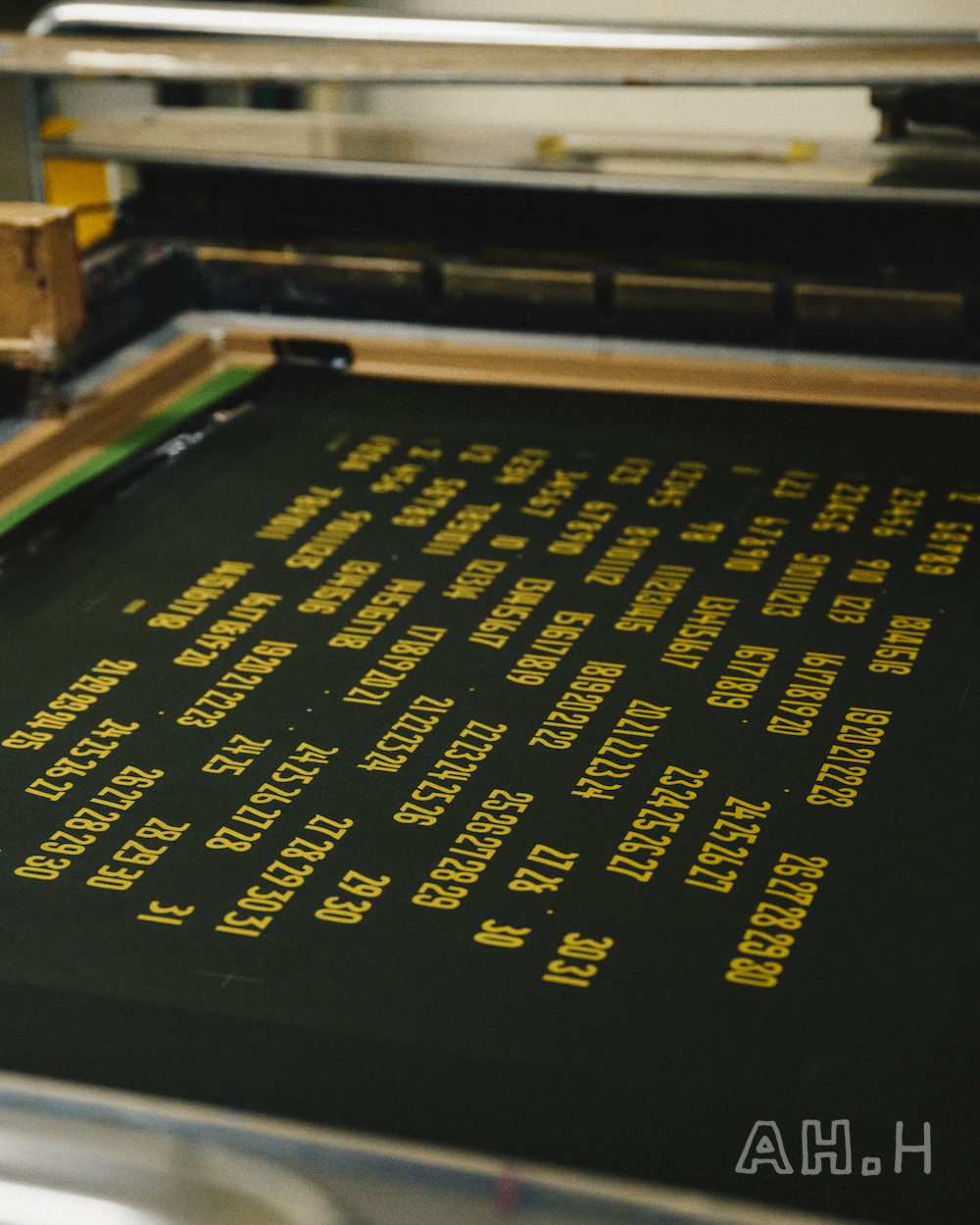 印刷所に着くと、すでにテスト印刷を始めているという。シルク印刷で3版を使って仕上げていくため、まずは平日を黒で、その後、祝日を白で、最後に日曜日をシルバーで仕上げていく。