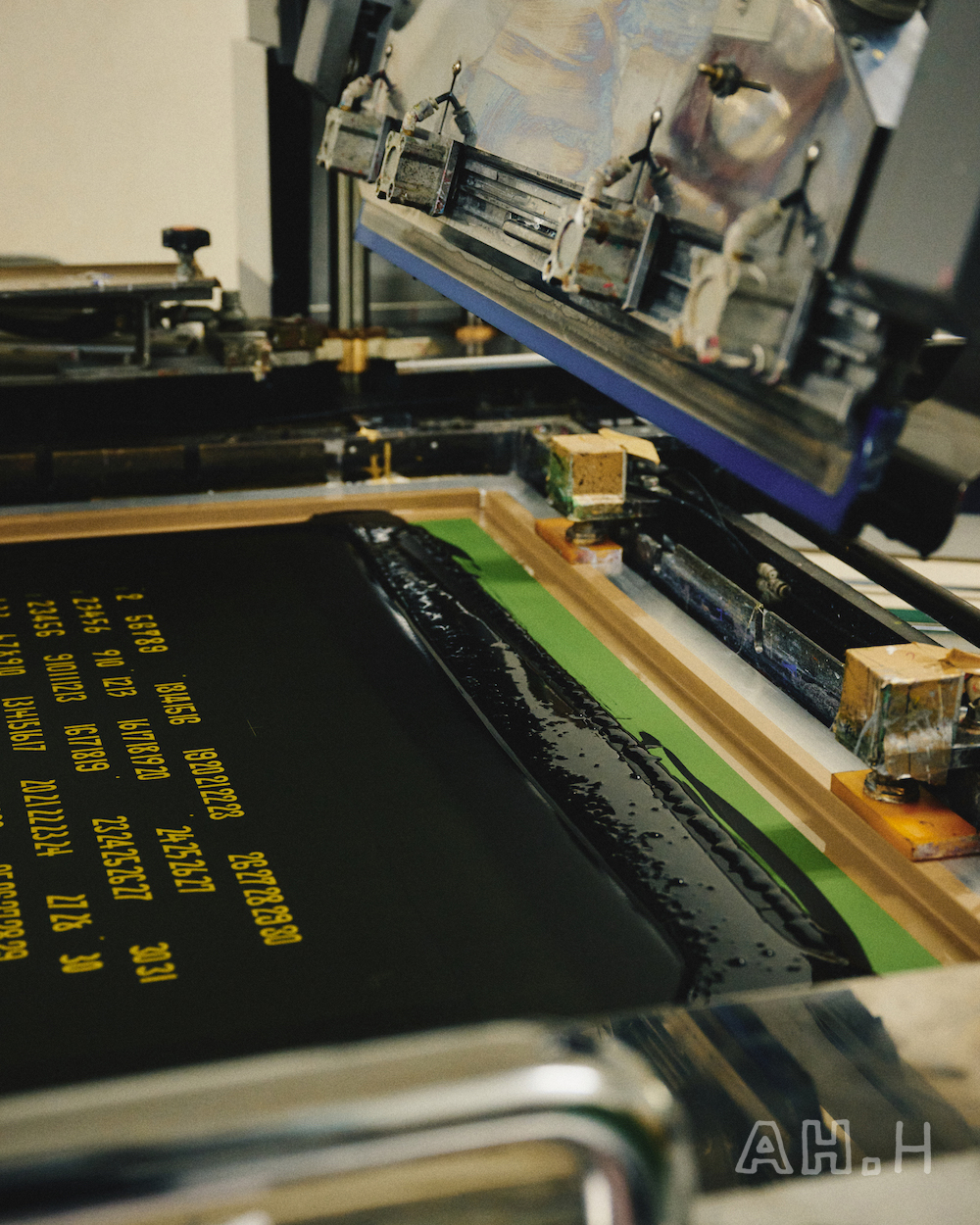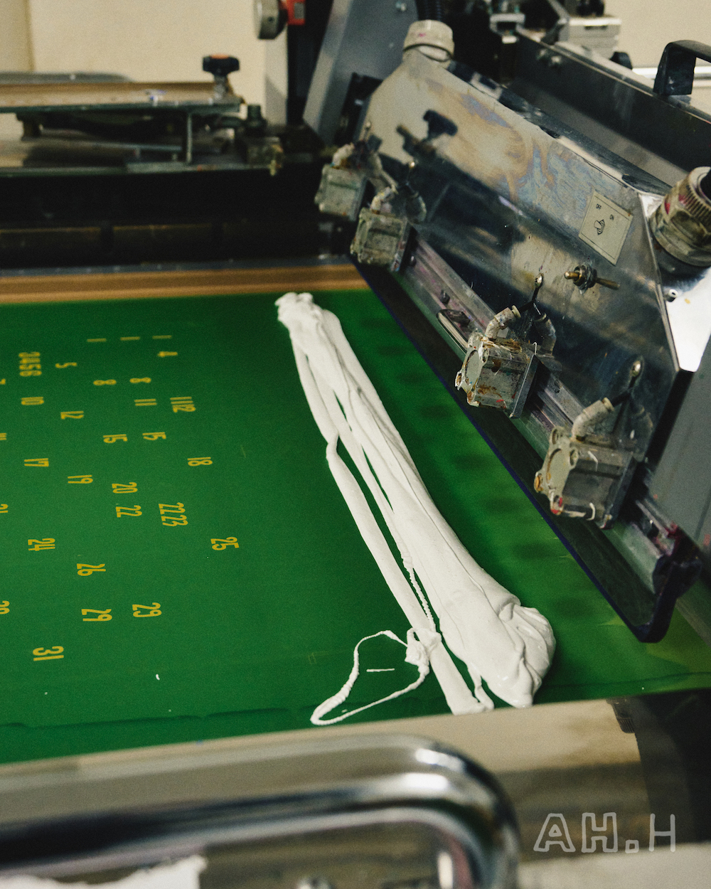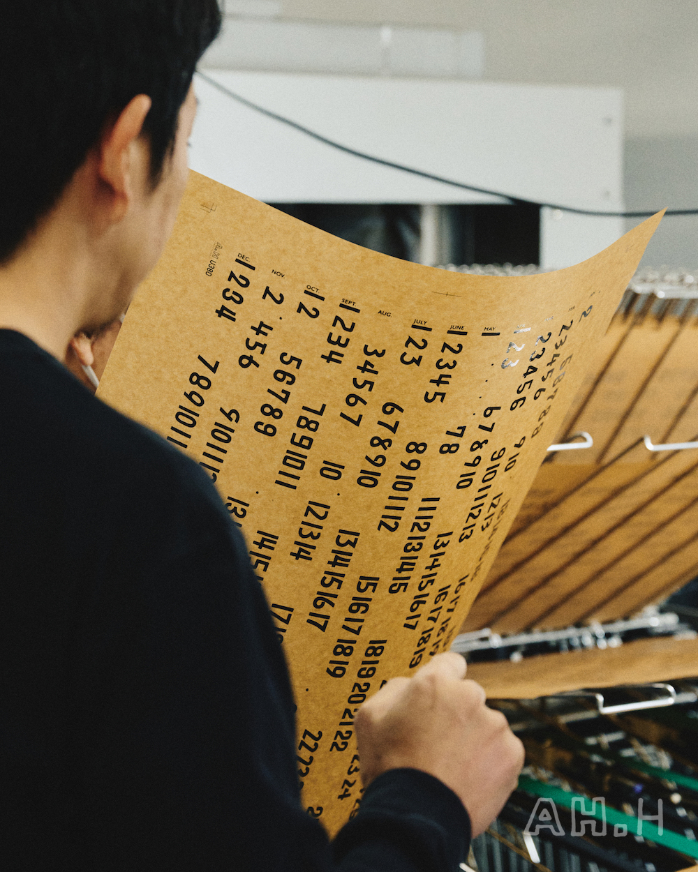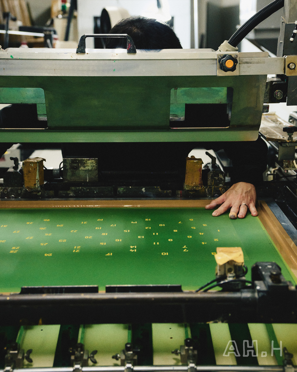 印刷所に着くと、すでにテスト印刷を始めているという。シルク印刷で3版を使って仕上げていくため、まずは平日を黒で、その後、祝日を白で、最後に日曜日をシルバーで仕上げていく。
