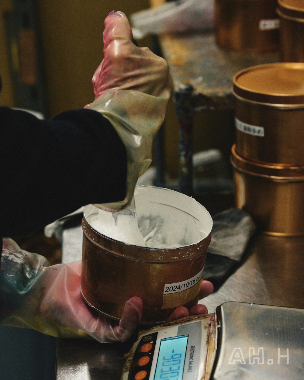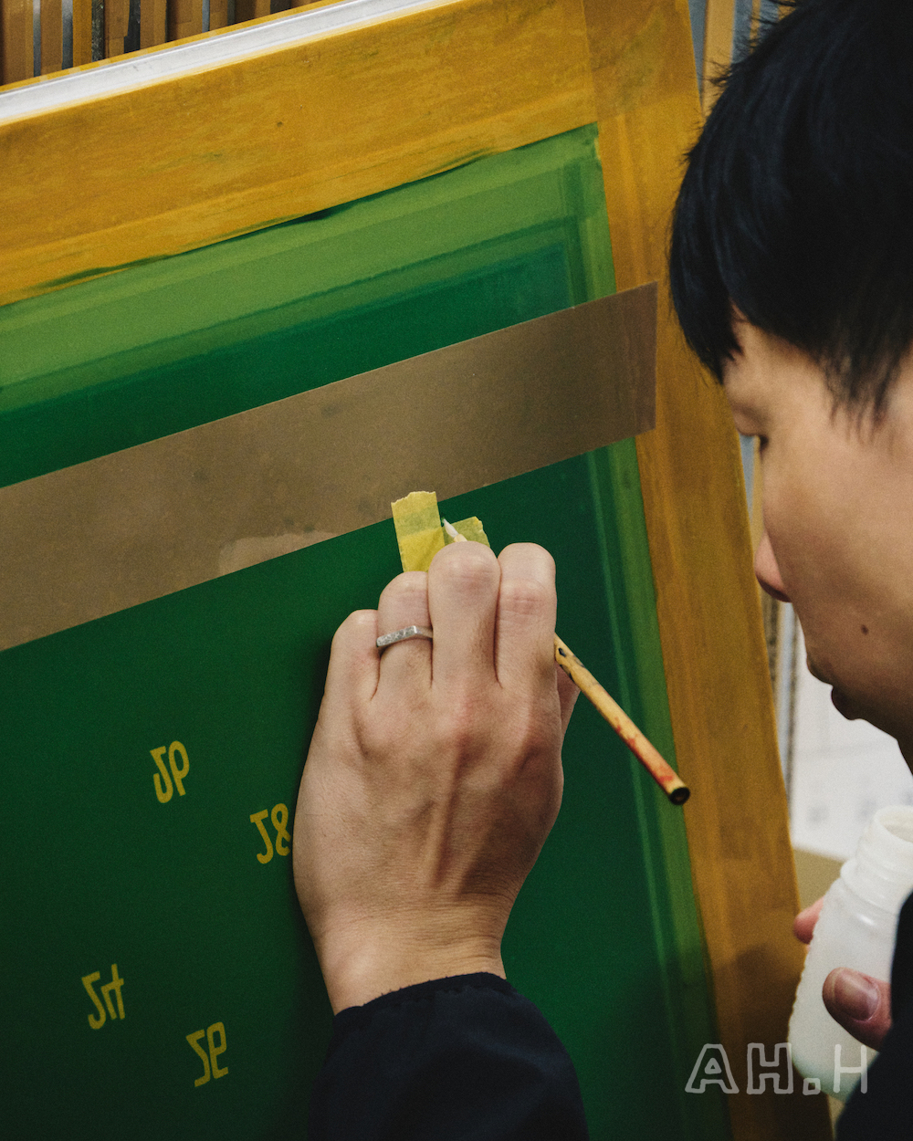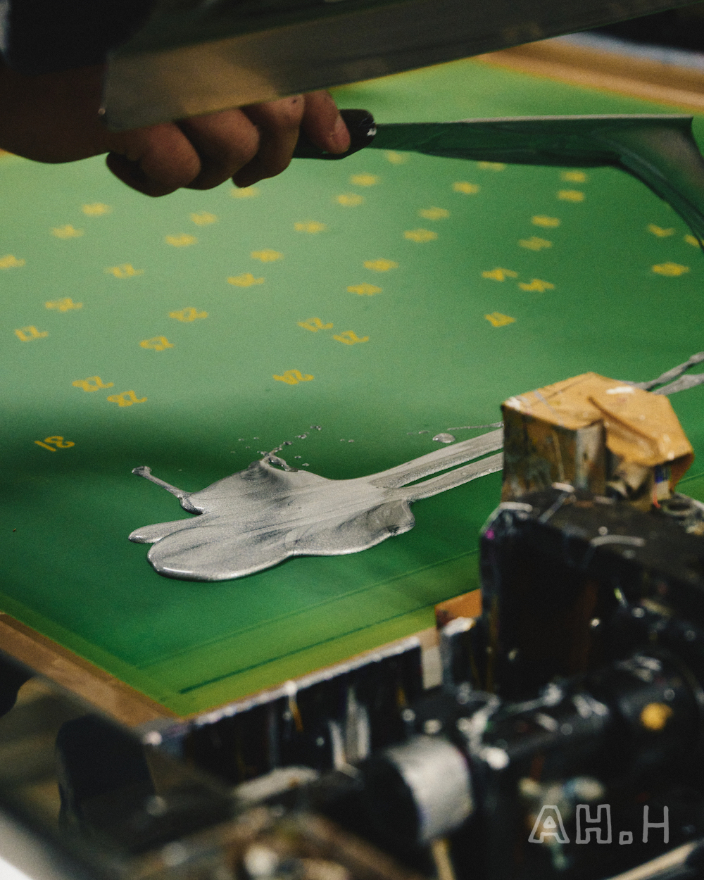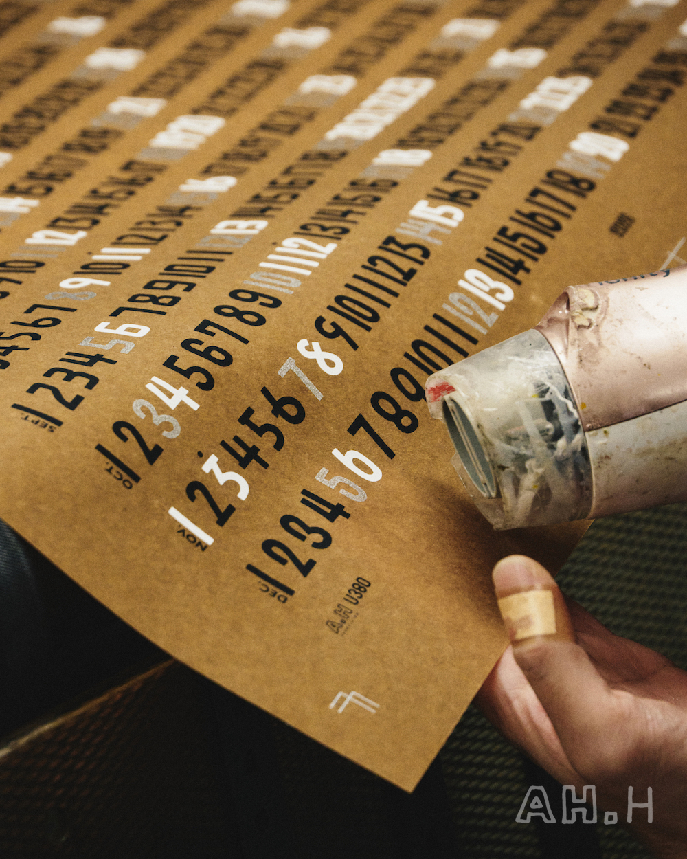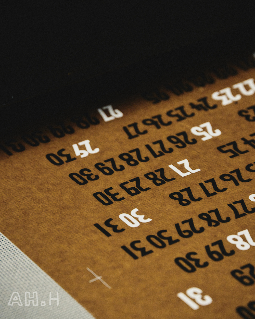 印刷所に着くと、すでにテスト印刷を始めているという。シルク印刷で3版を使って仕上げていくため、まずは平日を黒で、その後、祝日を白で、最後に日曜日をシルバーで仕上げていく。