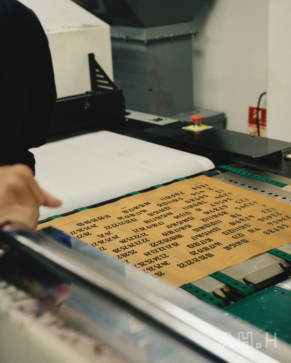インクが乗りにくい紙であるため、乗りが良い種類のインクで印刷を行っていった。テストで数枚刷ってみると、テスト用の印刷機ではマットな黒だったのだが、本番の印刷機では、同じ調合のインクで印刷しているのに光沢が少し強く出てしまっているとのこと。数分、議論をし、「もう少し時間を置いて乾いてくればこのマットに近づくけど、それを待っていると今日中には終わらない」とのことで、もう少しマットになっていくだろうことを想定し、このまま進行することになった。