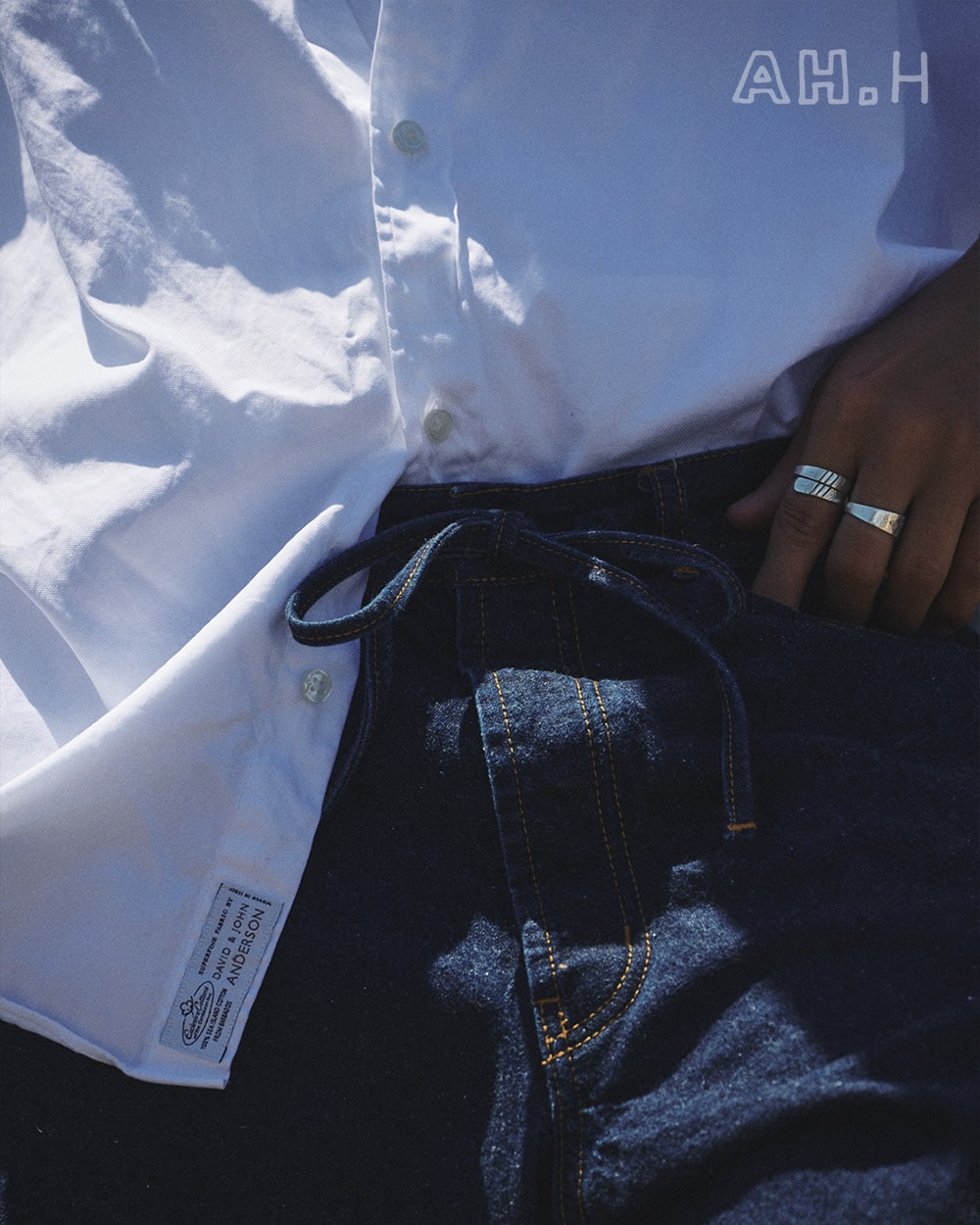 これは〈CAHLUMN〉のもの。デニムを作るのは難しいし、避けていたのだが、生地からしっかり作ることで、気に入ったものが出来上がった。高校生の頃に履いていたビンテージの「501」の、洗い込んで薄くなった生地感が僕は好きで、これなら夏でも履きやすいからだ。冬は中にタイツでも履けばいい。