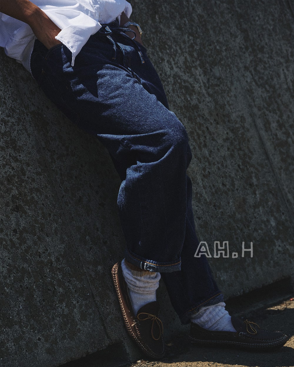 シャツ、デニムに合わせるならアメリカなテイストの古くさい靴がいい。少なくともスニーカーではない方が気分。時代と逆行するアナログな構造の、アウトソールすら付いていないモカシン。工芸品のような存在感で、大量生産できない、都会では売っていなそうな作りに魅力を感じる。少し前に「NEPENTHES」のお店で見て惚れ直し、ずいぶん前に購入したものを引っ張り出してきた。今では生産できなくなっていて、紐付きのタイプはもう販売されていない。ソックスも昔に購入したもので、ブランドは〈POLO RALPHLAUREN〉。ルーズな雰囲気になるように作られていて、履きこむほどにいい雰囲気になっていく。