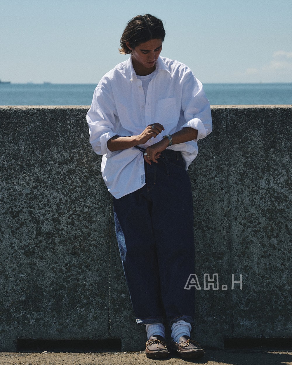 白いシャツにはデニムを合わせたくなる。リジッドのままだと色移りすることもあるから、数回洗ってからの方がいい。
