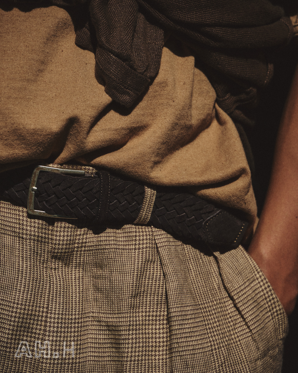 合わせているのは〈Polo Ralph Lauren〉のリネンのチェックトラウザーズ。化繊でできた服は、とにかく安いから、世の中にたくさんある。でも、ツルッとしている分、安っぽさは避けられない。天然素材の自然なシワには、化繊には作れない趣きと高級感がある。京都の寺の庭を見て、なんかいいなぁと思う感じと同じようなもの。都会のビルの中に作られた中庭なんか見たって気が紛れないのと同じように、バリッとした化繊の服を着たところで、仲間への愛や明日への活力は生まれない。シルエットは〈Polo Ralph Lauren〉の2タックチノと同じようにゆったり、太い。このシルエットこそがラルフ・ローレンであるし、これこそが今の気分。細いパンツはまだ穿けない。