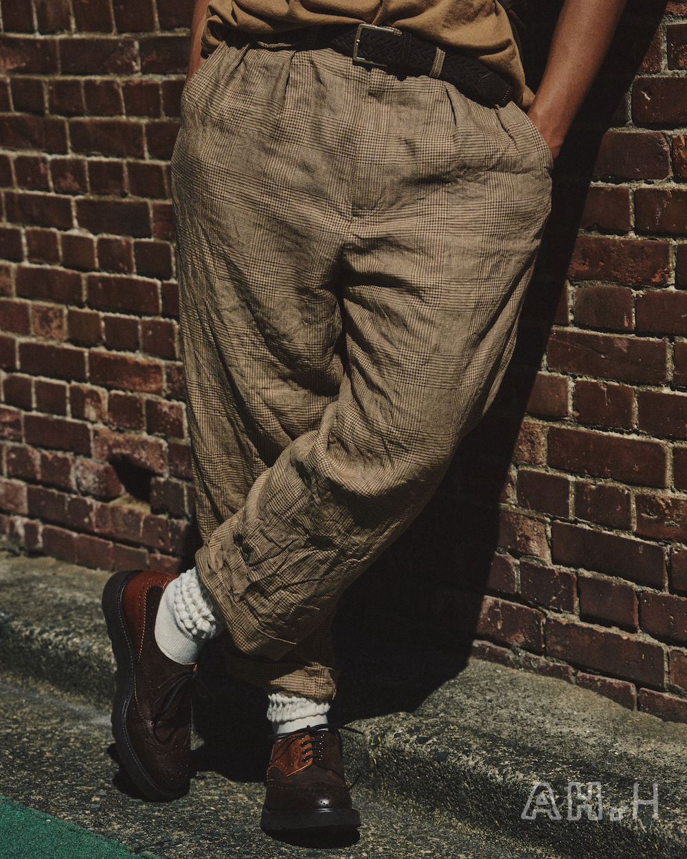 〈Polo Ralph Lauren〉リネンチェックトラウザー ¥50,600(RALPH LAUREN)、〈ENGINEERED GARMENTS + Tricker's〉フルブローグギブソンシューズ ¥132,000(ENGINEERED GARMENTS)、ソックス私物