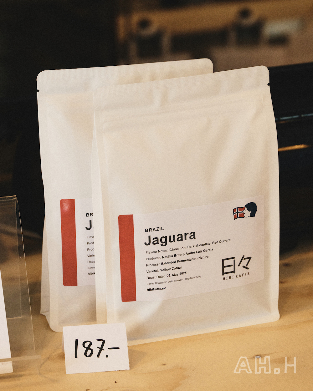 お店のなかにあるロースタリー「日々 HIBI KAFEE」でローストした豆。浅煎り。187クローネ(2618円 ※取材当日は1クローネ=約14円)