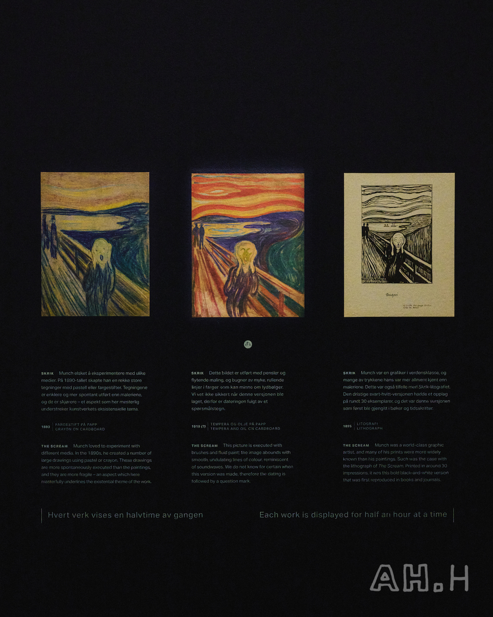 意外と知られていないかもしれないが、『叫び』は一点だけではなく複数点存在する。この日は3点の『叫び』が展示されていた。そして各作品は30分ごとに入れ替わりで展示されるという仕組みとなっている。どんなふうに入れ替わっていくのかは、ぜひ自身の目で確かめてもらえると。