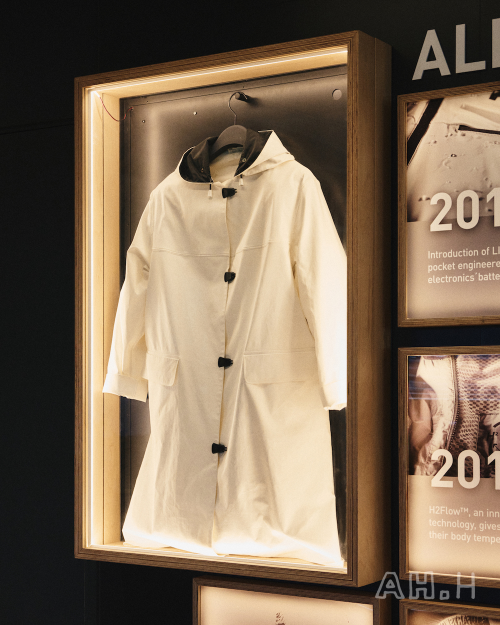 テクニカルな素材の開発などで、今もなお数々のイノベーションを生み出している〈HELLY HANSEN〉。展示製品のなかで最も古いアイテムは、1924年に〈HELLY HANSEN〉が開発した、画期的な防水素材「LINOX(リノックス)」を使用したコート(のレプリカ)。光沢があって美しい生地の表面には防水加工が施されており、これまでの防水製品のような油のべとつきがないのが特徴。原材料は企業秘密として厳重に守られているそう。発表から30年以上にわたりベストセラーを続けた、ブランド初期の代表作である。