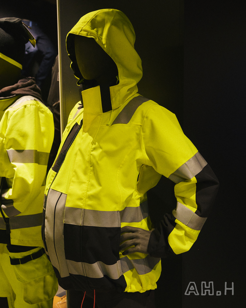 なんとマタニティ用のワークウェアも販売されている。いかに広い層に受け入れられているかが実感できるというものだ。ちなみに、ワークウェアの各所に配されるリフレクターには容量の基準があるそうだ。また、安全性に配慮し引っかかり防止のためにループを作らないようにしているなど、シティウェアとは全く別の考え方で、開発されていることがよくわかる。