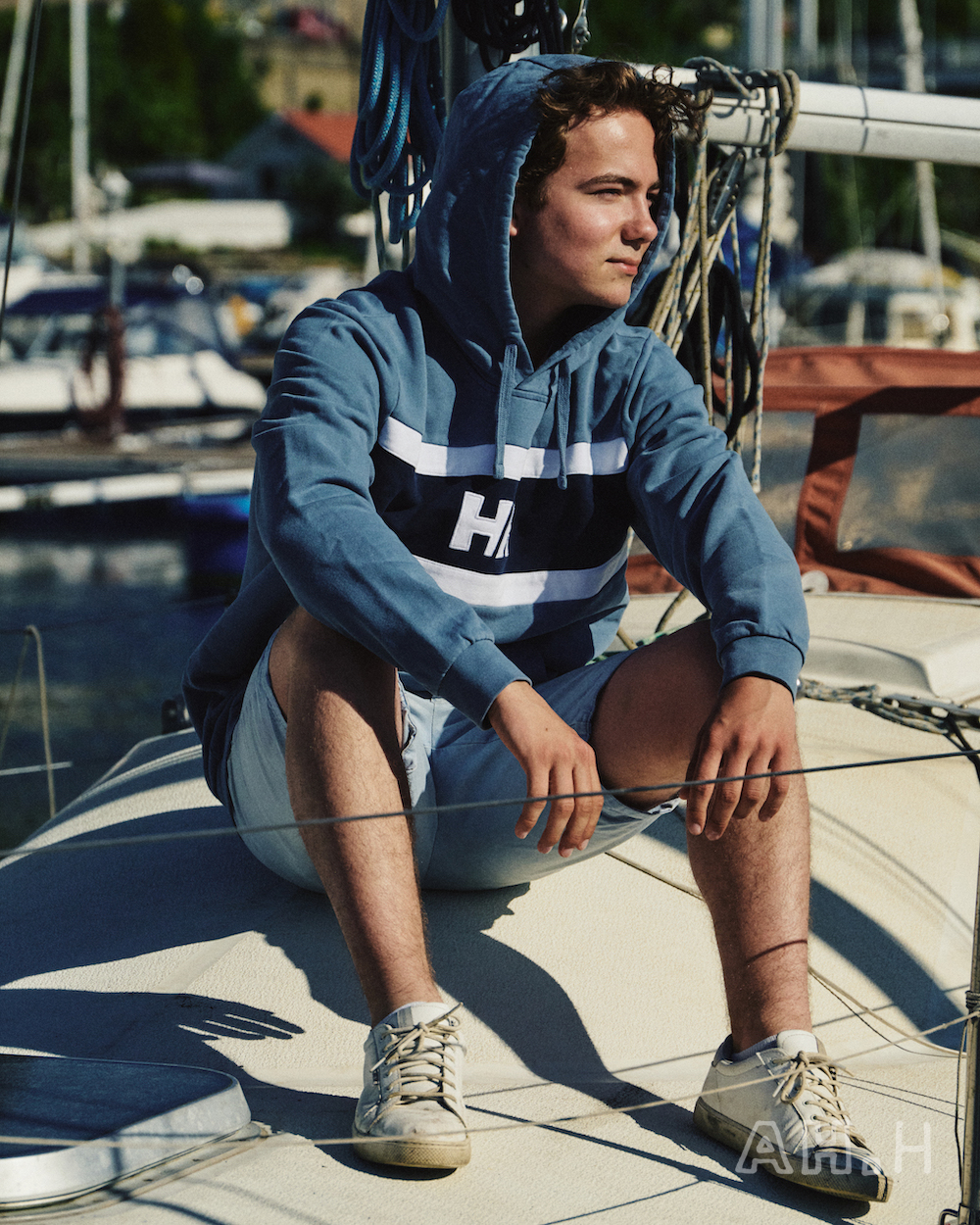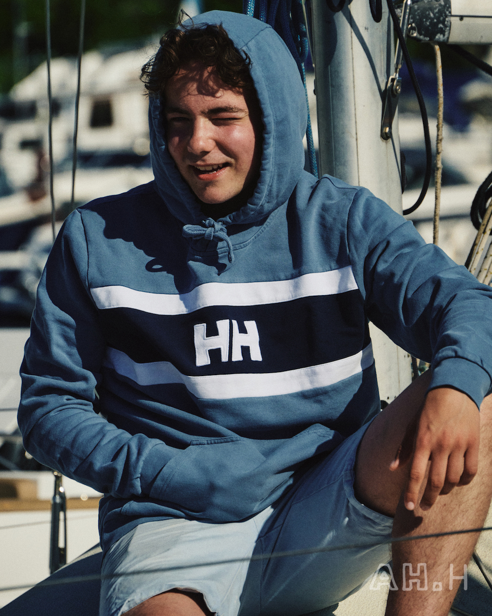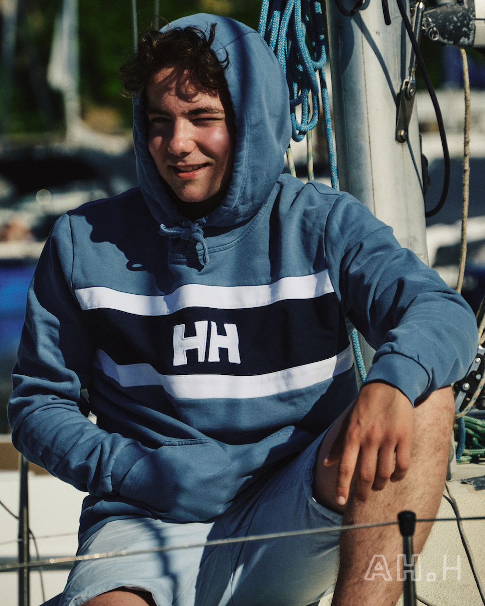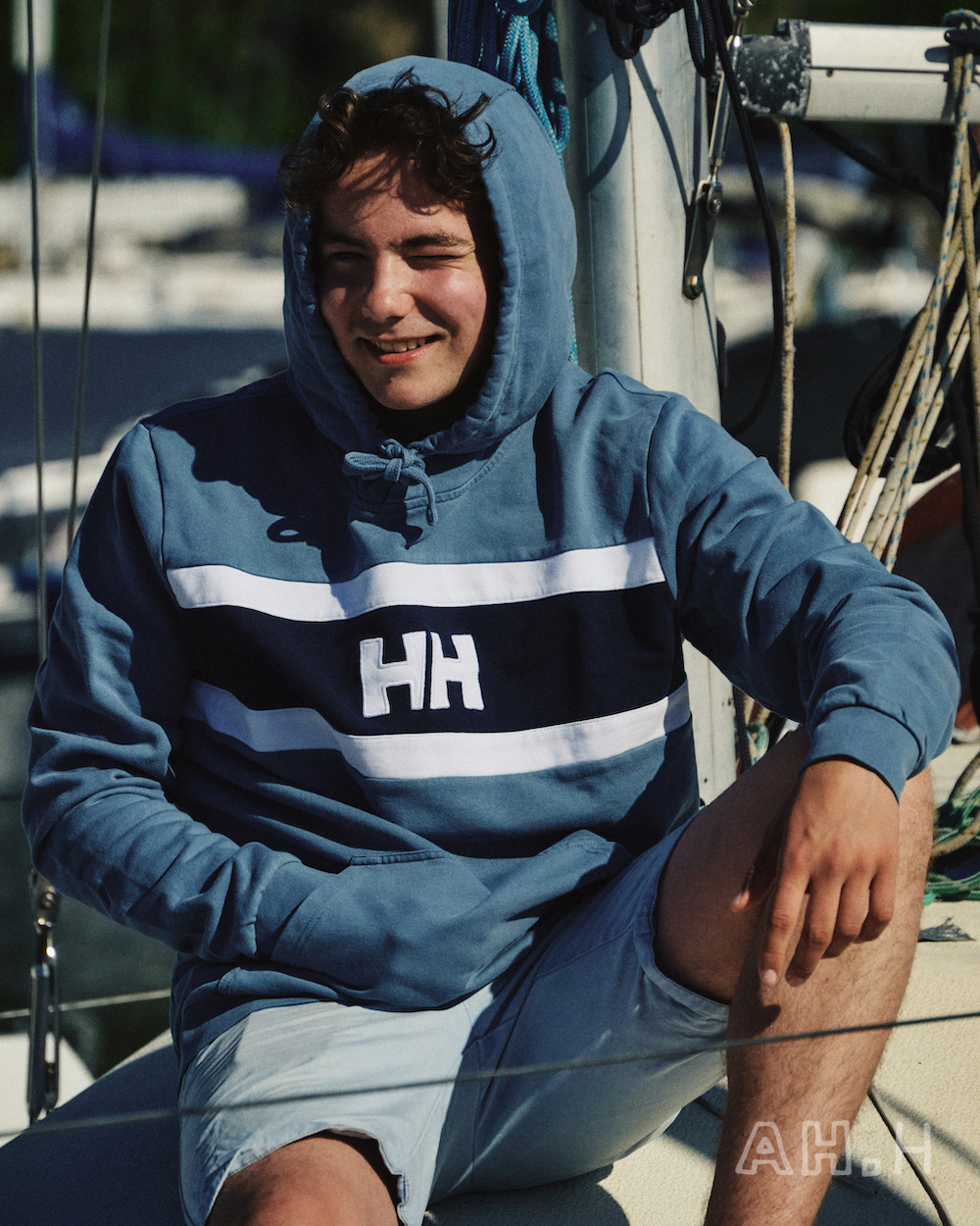 オーガニックコットンを使用した、どこかレイドバックした雰囲気のフーディー。〈HELLY HANSEN〉のシグネチャーである旗のストライプと、本国仕様のミニマルなHHロゴをあしらっている。