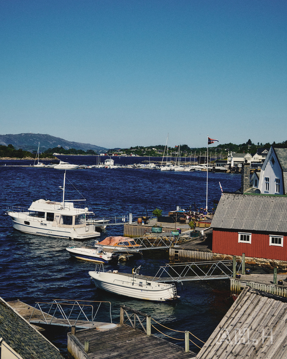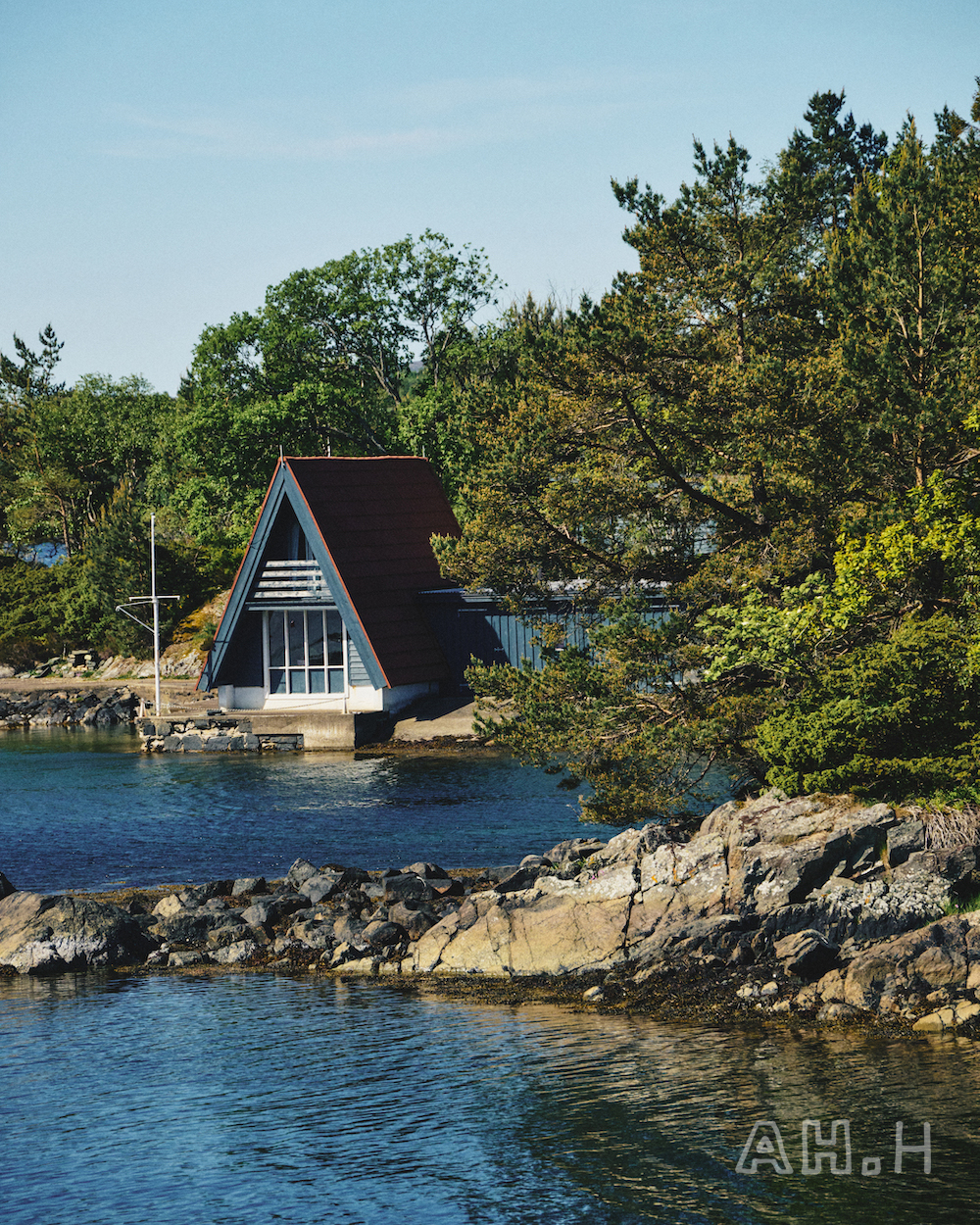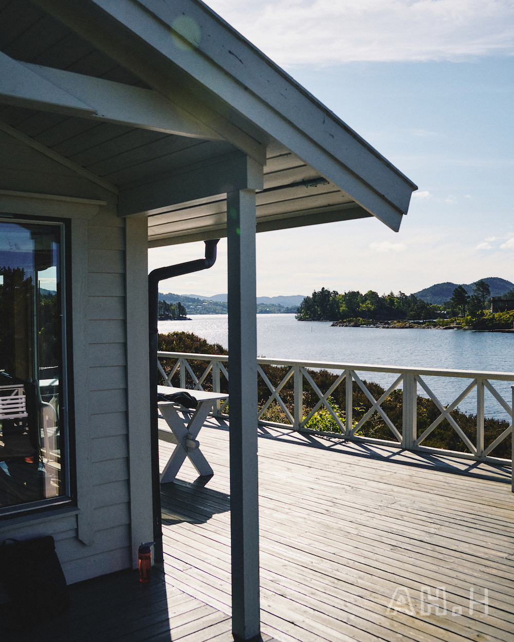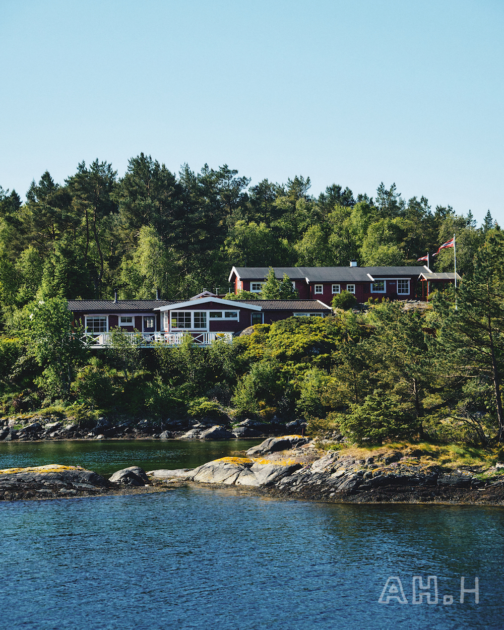 ノルウェーといえばの、美しいフィヨルドをモーターボートで走ること20分。〈Norwegian Rain〉 のベルゲンショップのマネージャー、エリンさんの父母が購入したというヒュッテに到着。