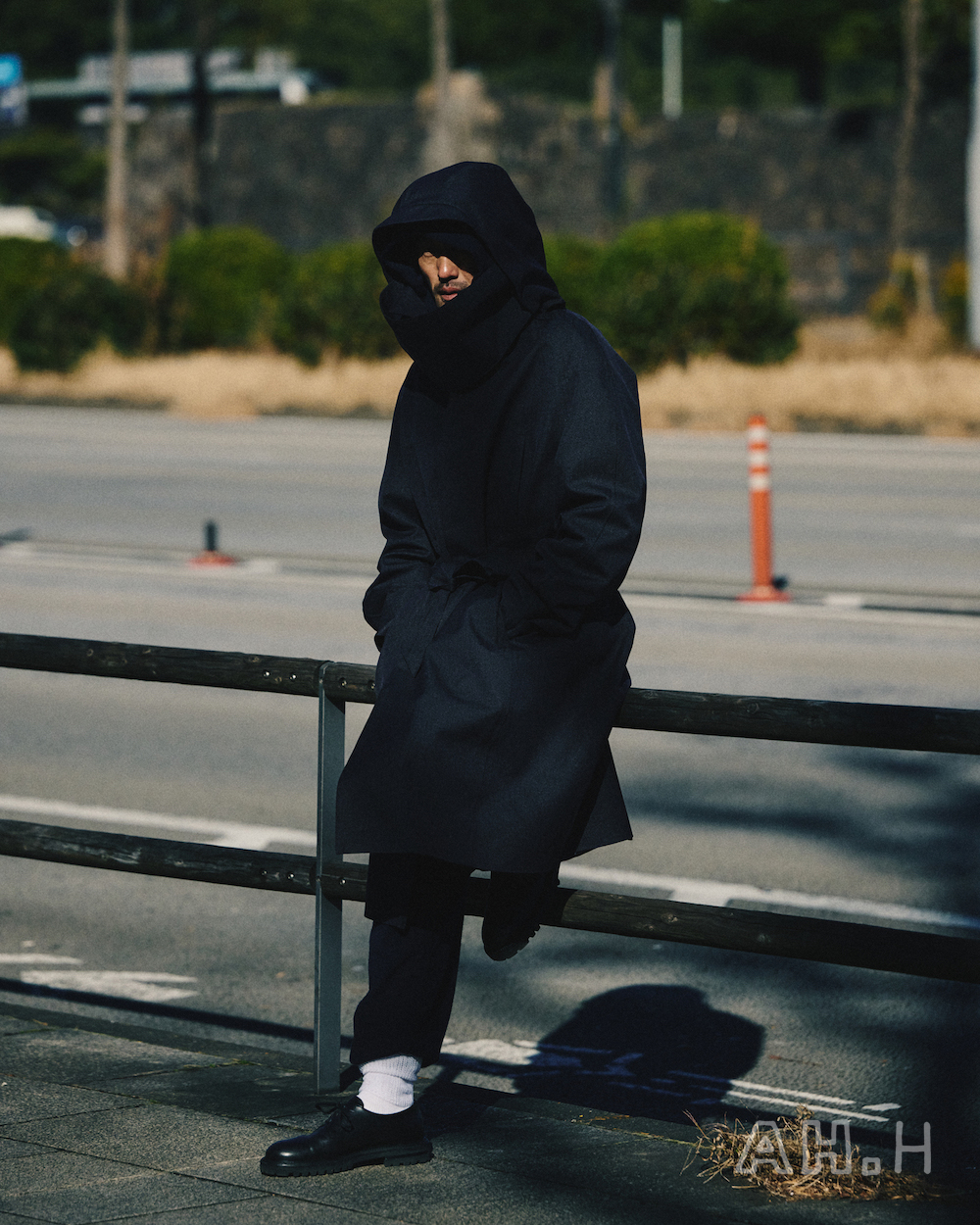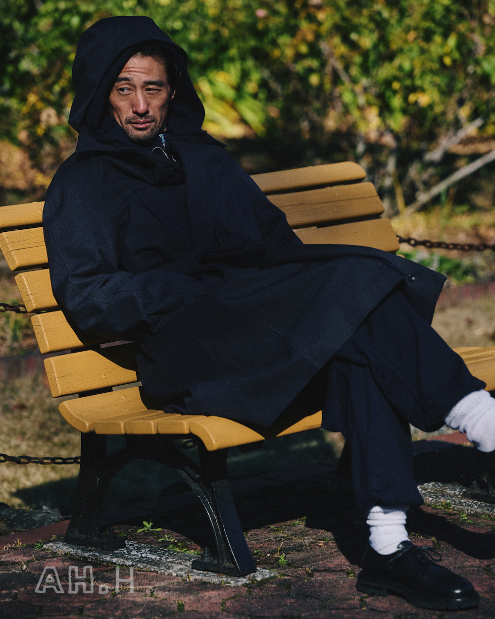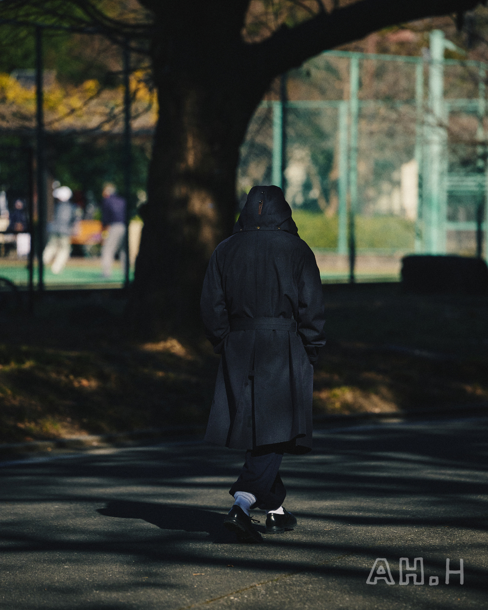 その時に、ベルゲンの街を案内してくれたのがT-マイケルさん。このレインウェアのブランド〈Norwegian Rain〉のデザイナーである。このレインコートは、ベルゲンの彼の店でそのときに購入したもの。テーラーのブランドも展開している彼の技術を活かしたパターンをベースに、着物を思わせる形やミリタリーを思わせるフードやウエストベルトなどのディテールにこだわって、街着のコートとしてもシックに見えるように作られている。