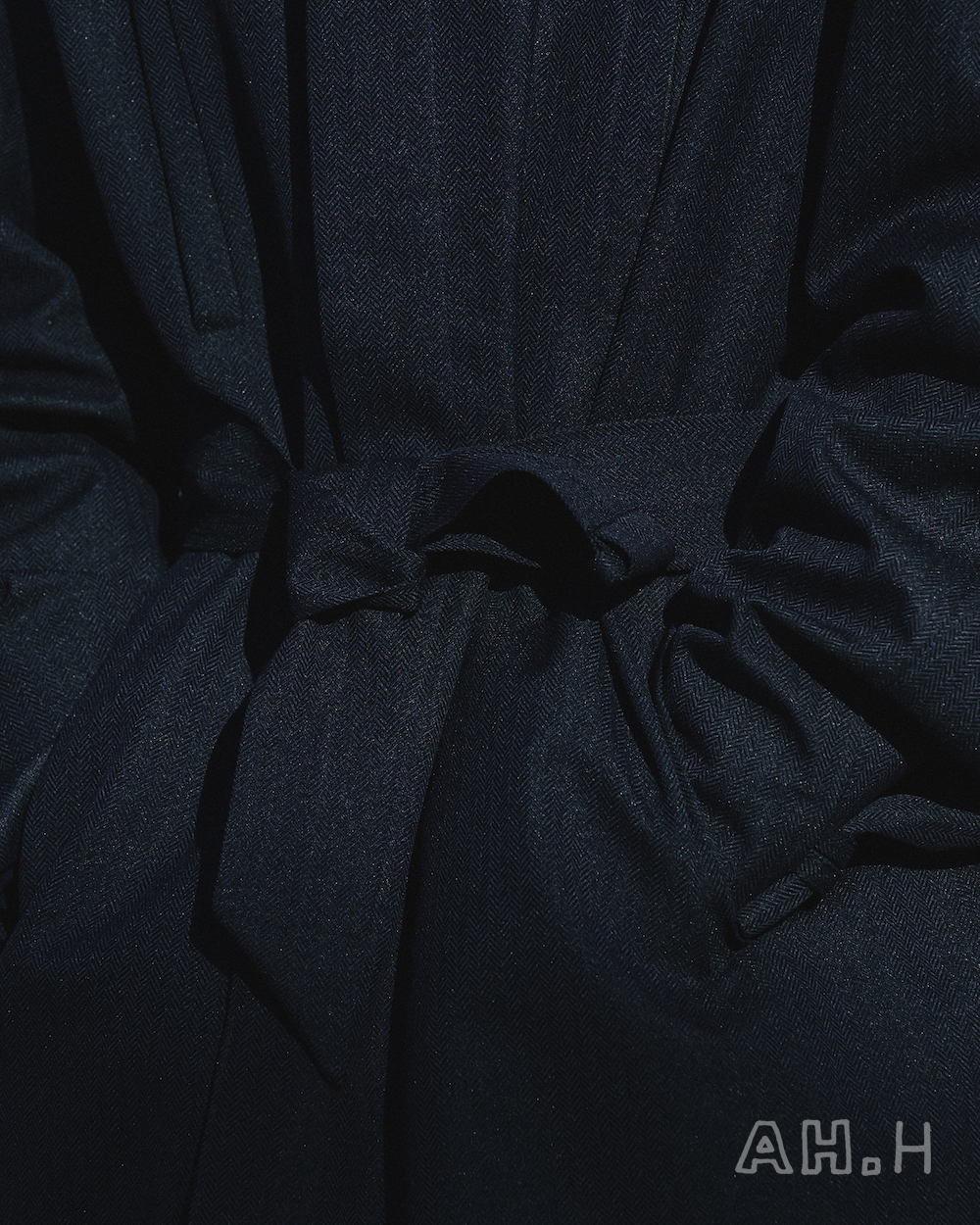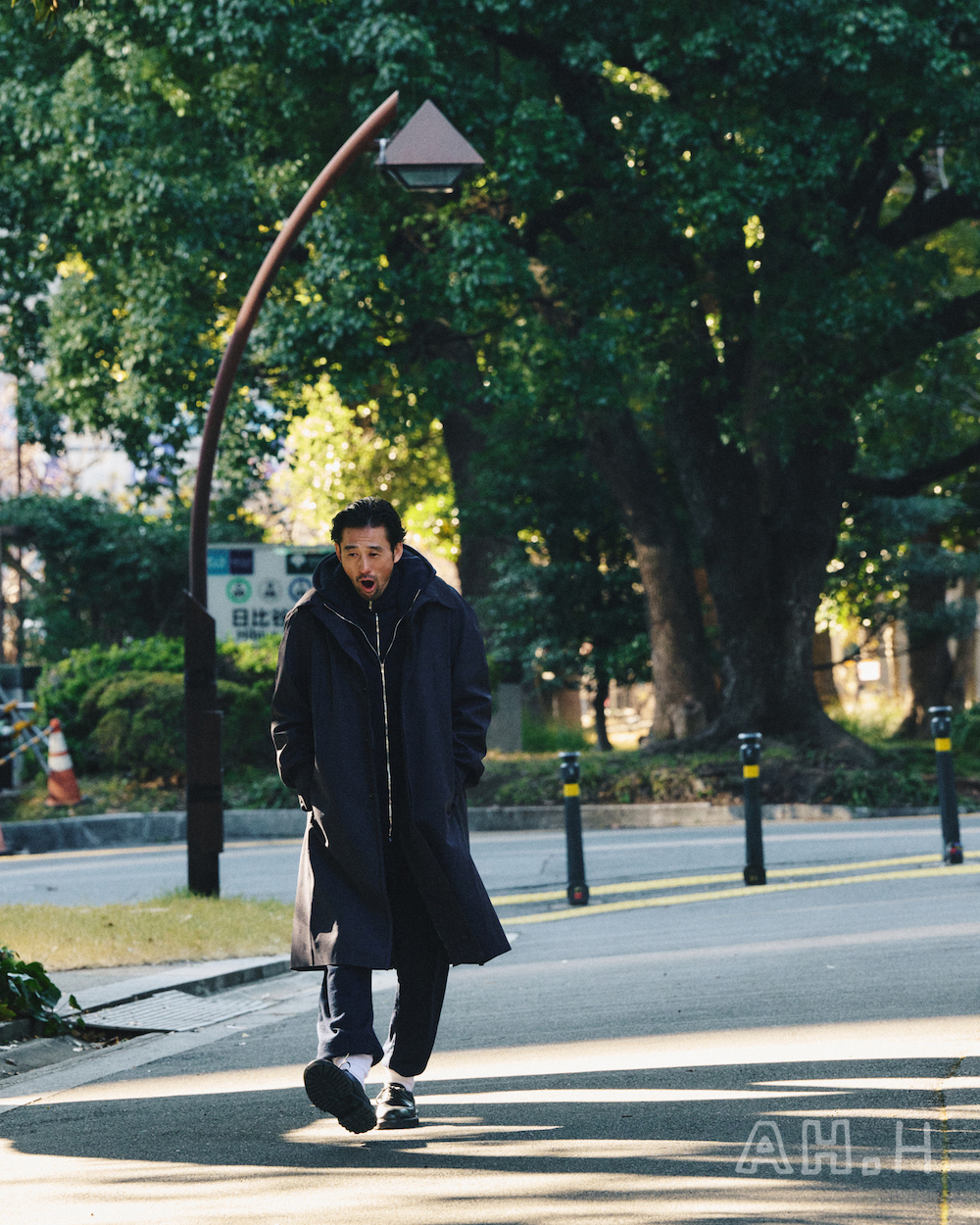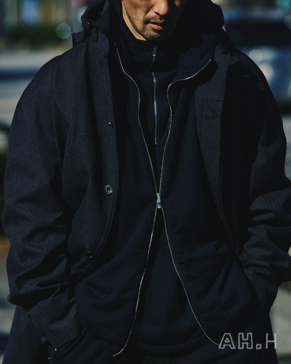 ヘリンボーン織の防水の生地は日本製のリサイクルポリエステル。透湿を司るメンブレンもリサイクル素材。しかも、アウトドアブランドを凌駕する、嵐にも耐えうるクオリティに仕上がっている。外国人がディレクションする日本の生地だけあってか、どこか着物を思わせるような柄や色が多い。僕が購入したのはヘリンボーン織りの柄になっているもの。色はもちろん、ネイビーだ。