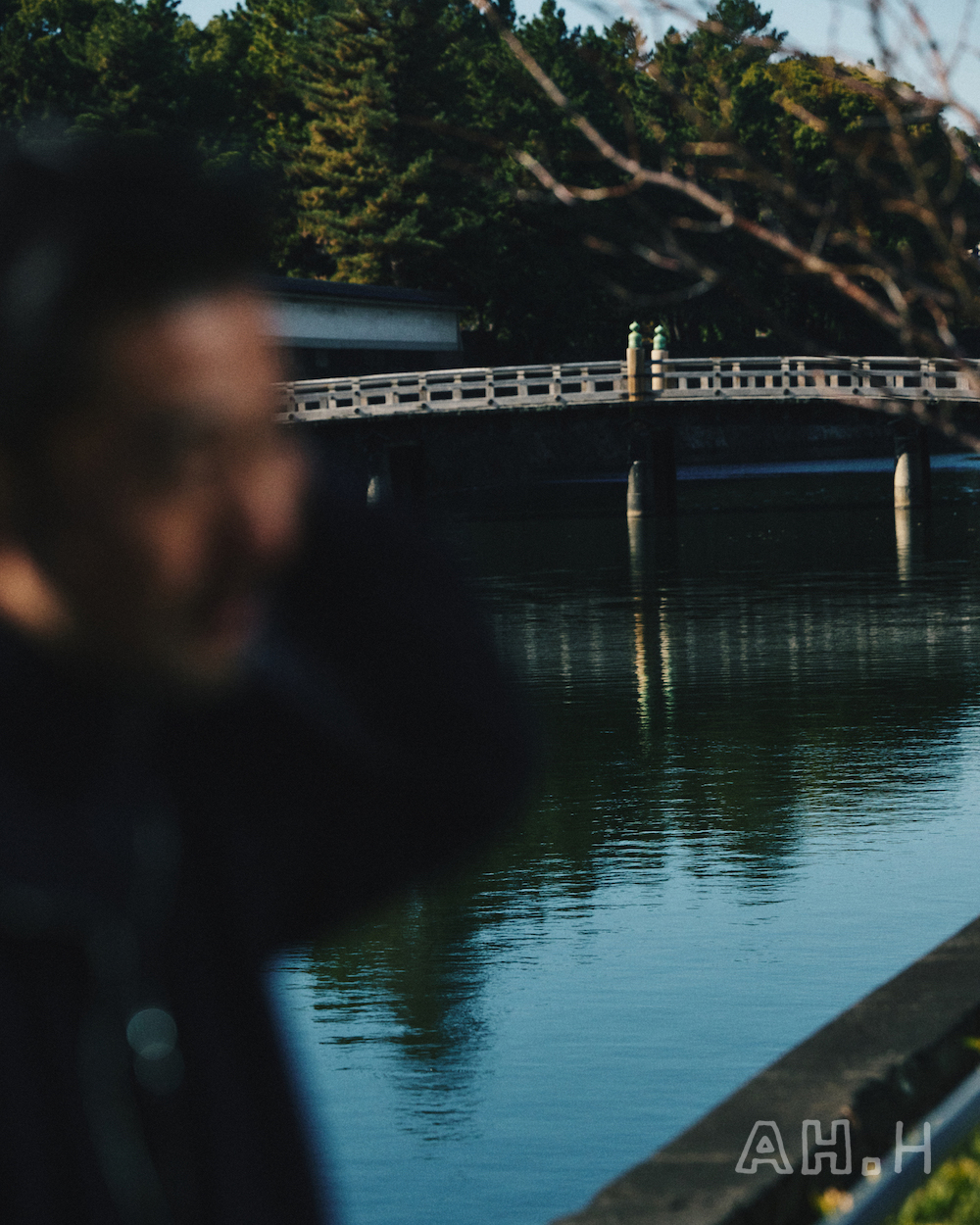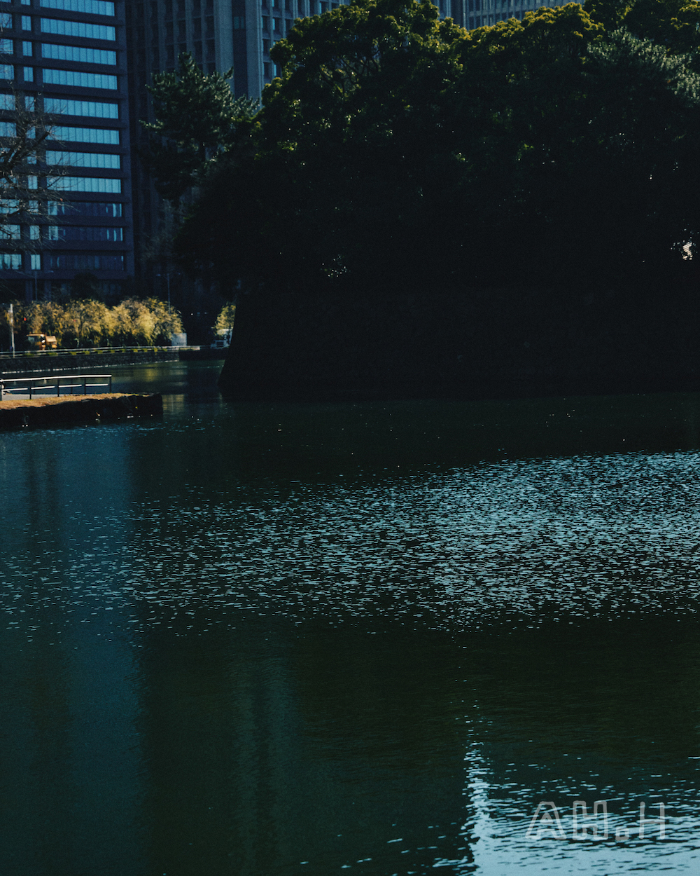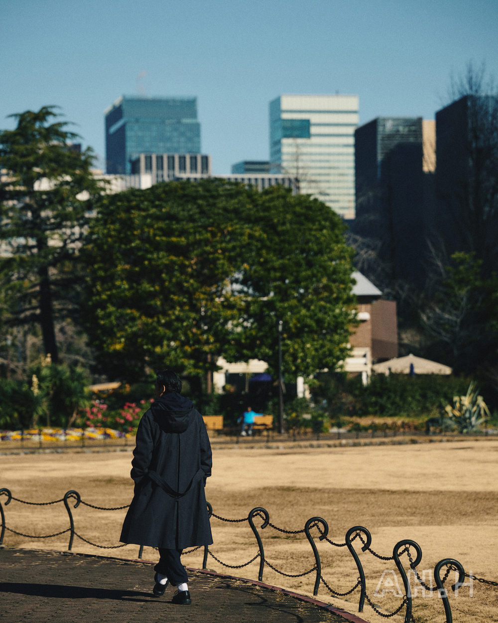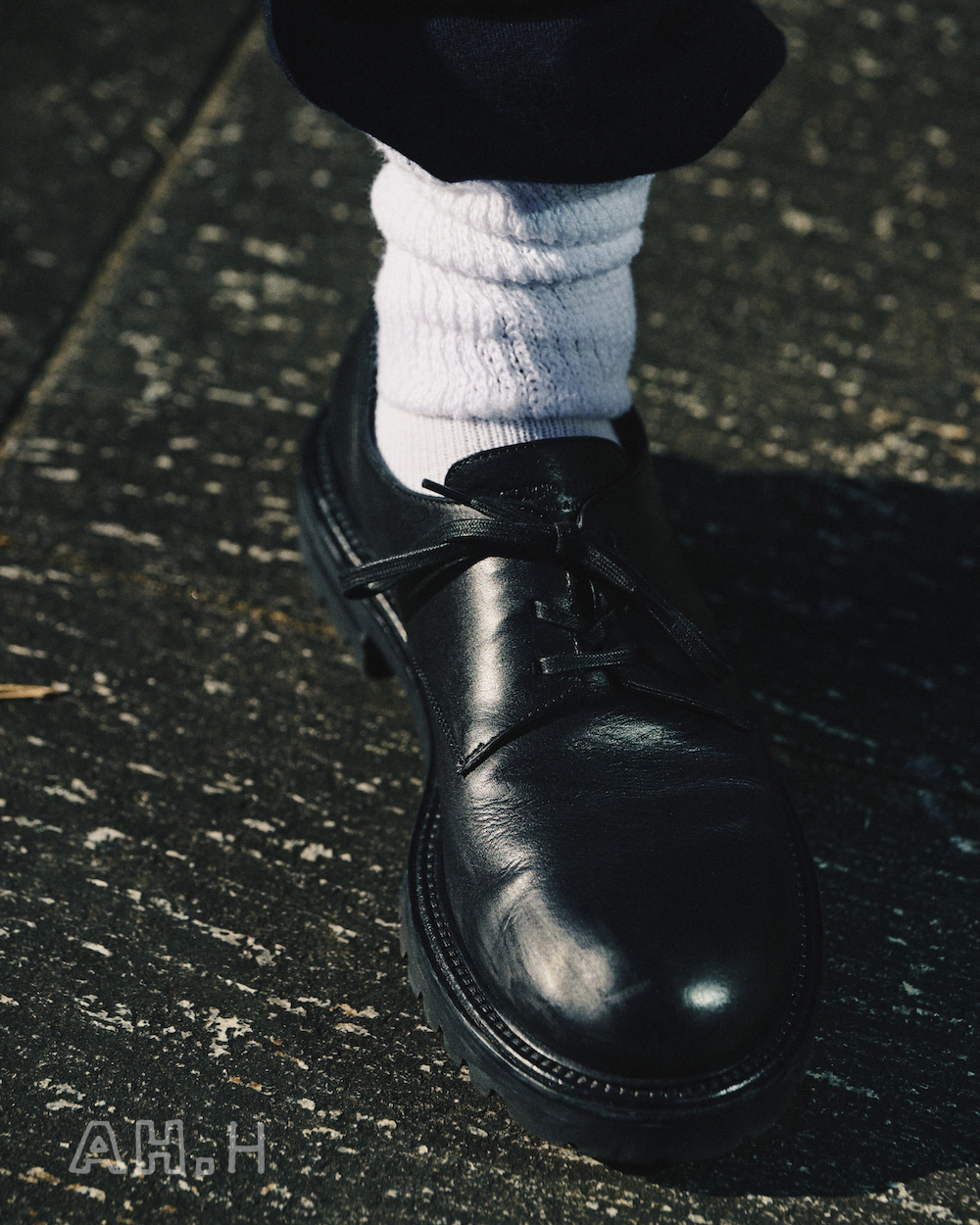 スニーカーも合うけど、革靴も合う。これは以前にも紹介した〈GIORGIO ARMANI〉のもの。日比谷から皇居あたりを歩くのなら、たまにピリッとした足元を楽しみたい。ソックスはもちろん白。このコントラストが、足元をクリーンに見せてくれる。
